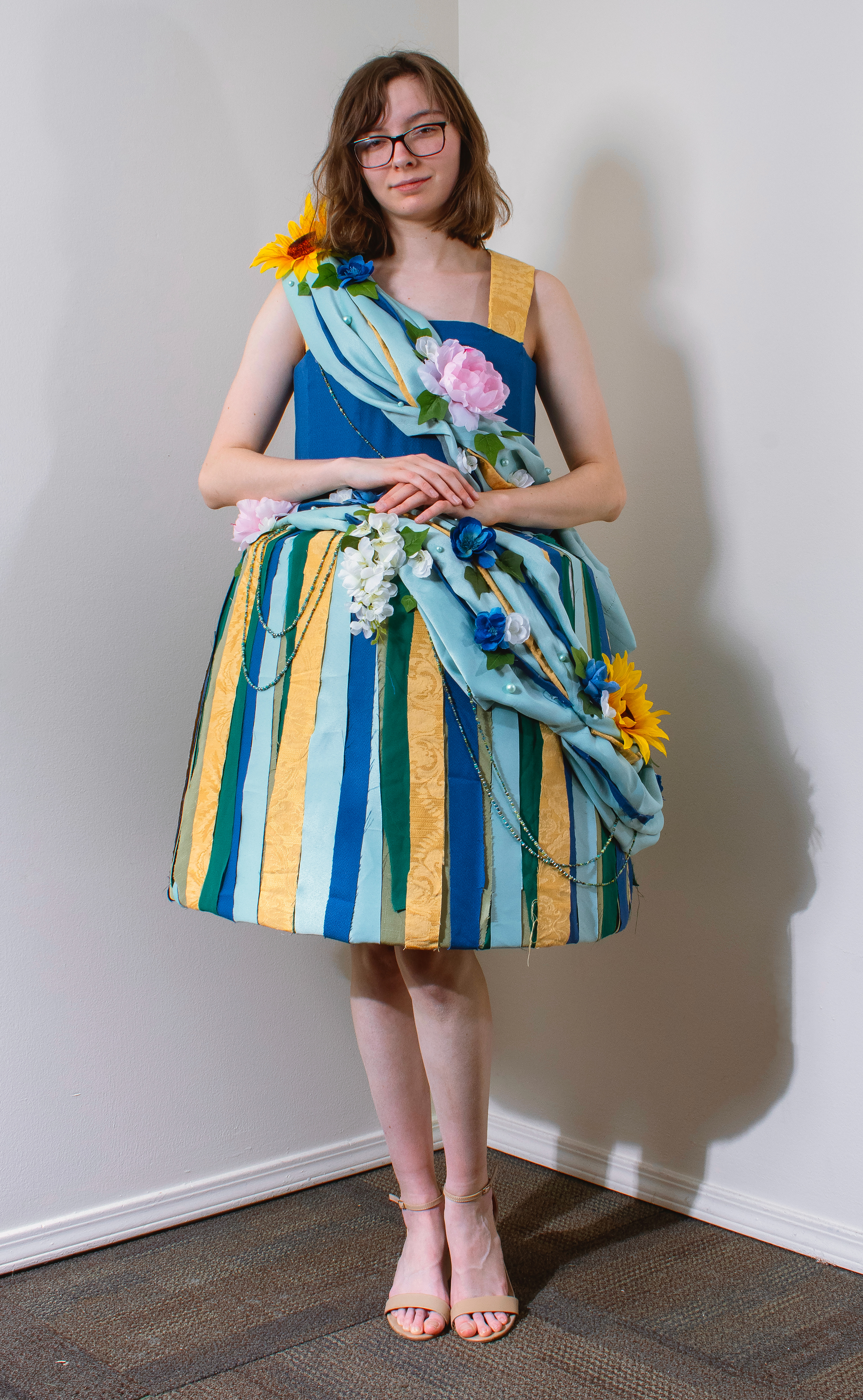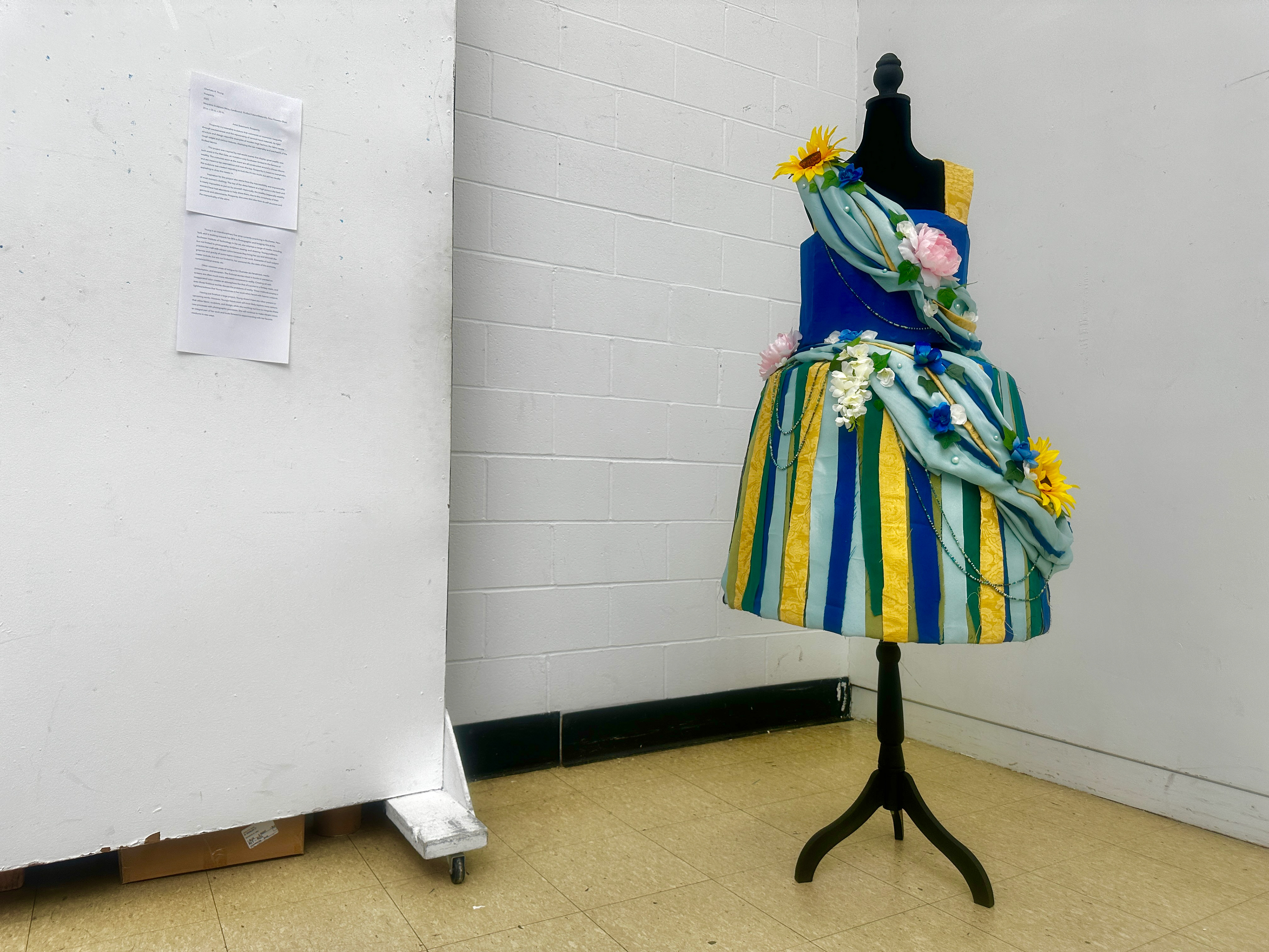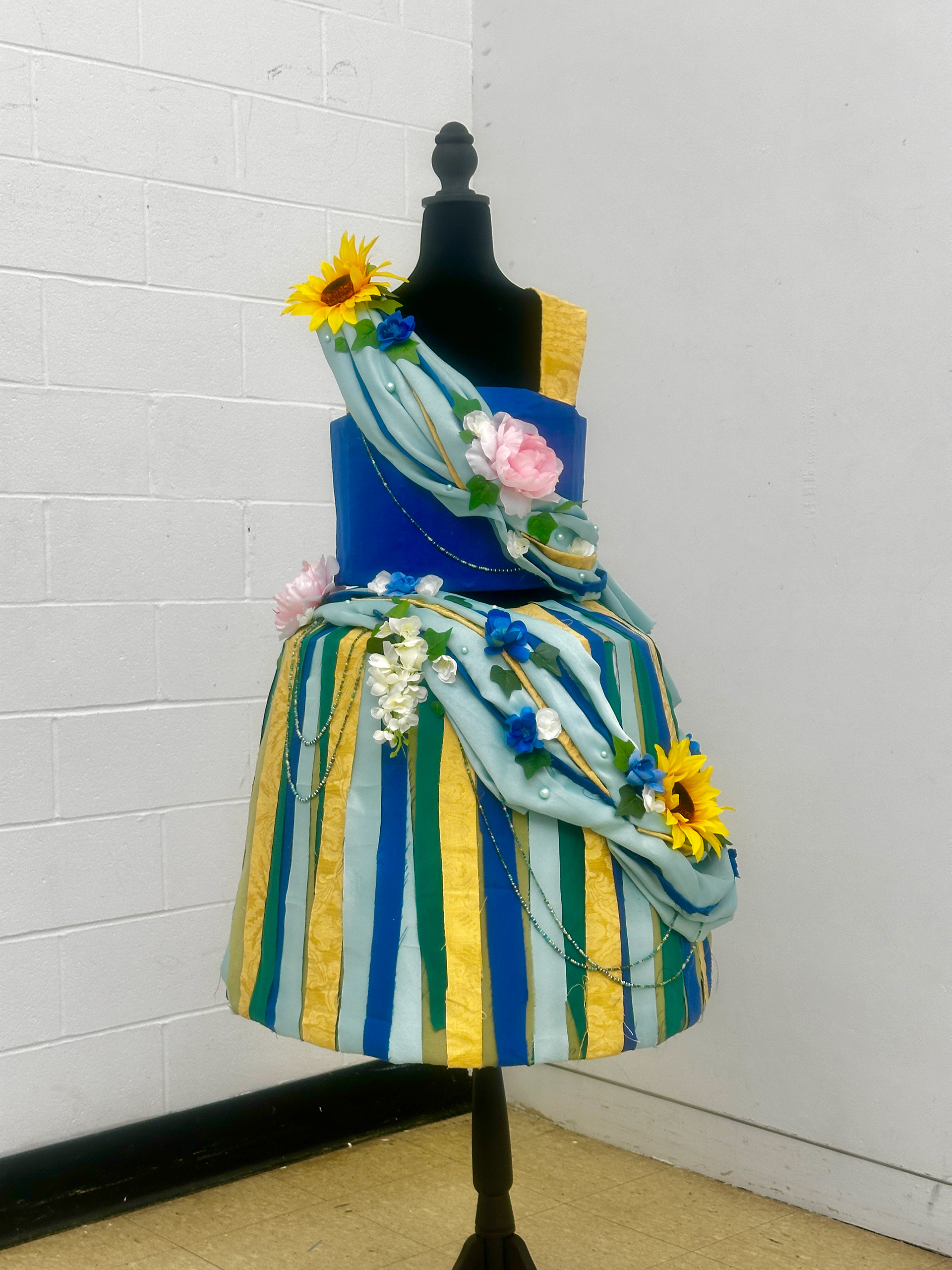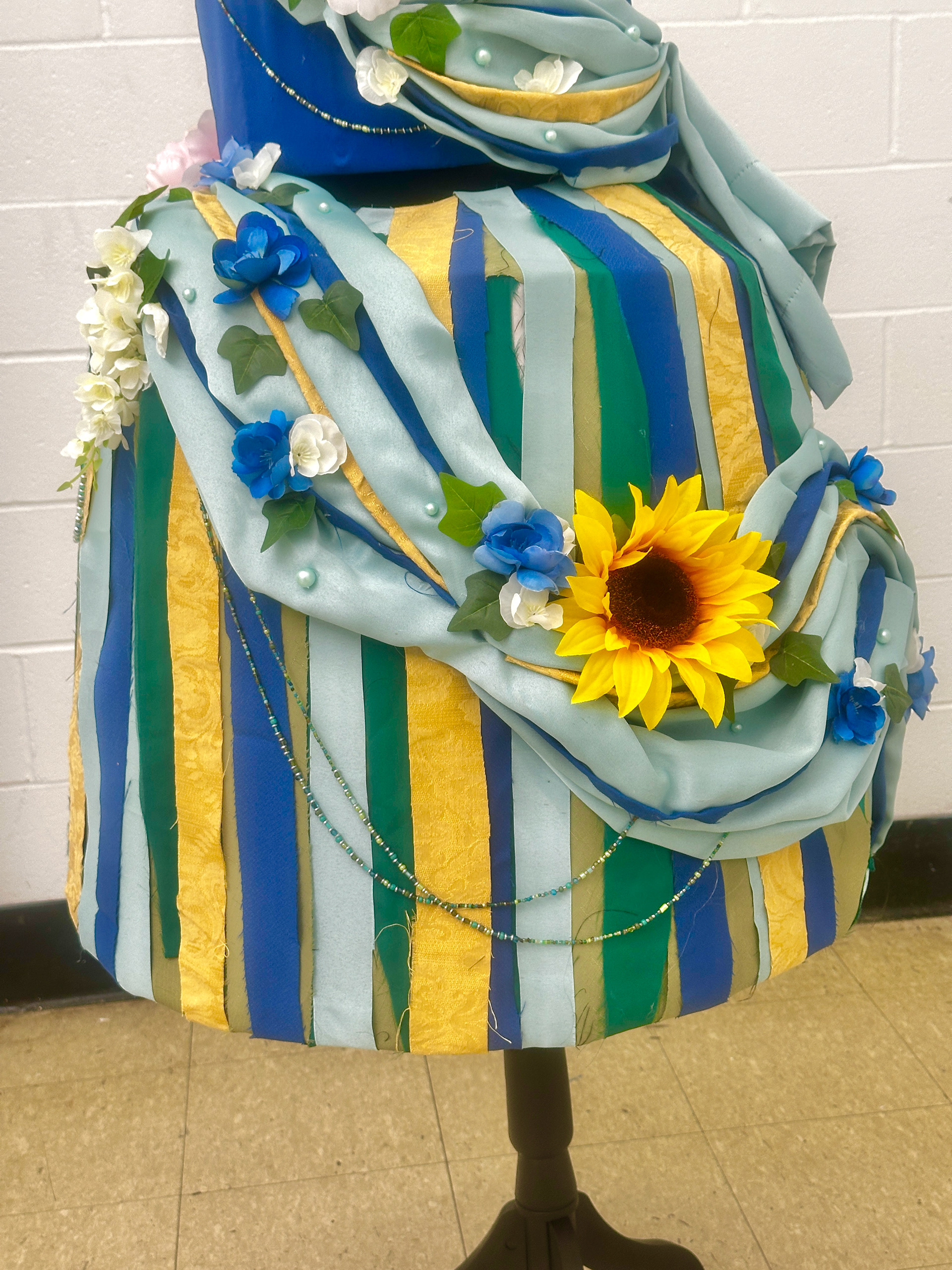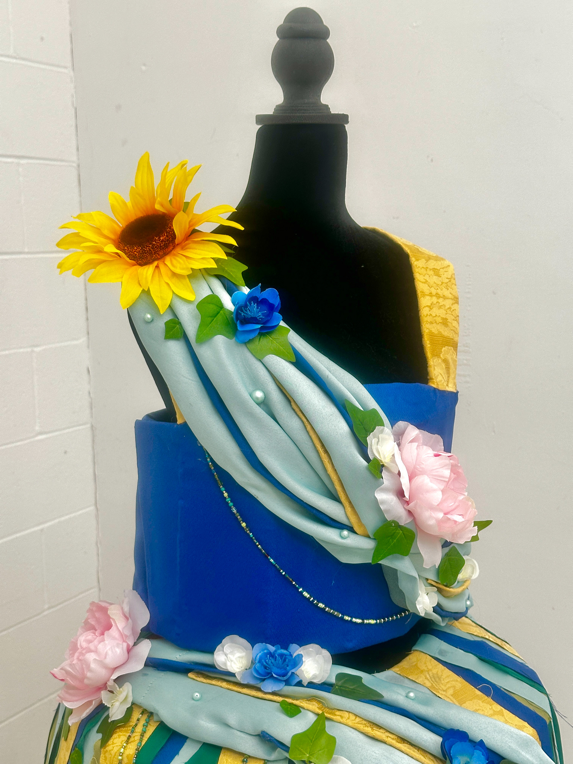 Prosperity is a sculpture that comments on economic inequality through excessiveness and the repurposing of second-hand materials. Its rigid structure and design resemble examples of modern high fashion; the fabric sports rough edges and various textures, displaying the raw materiality and patchwork of the thrifted fabrics. Additionally, some inspiration has been taken from the natural world, with the name ‘Prosperity’ relating to abundance and bountifulness. The draped fabric is meant to represent a river; the fluidity and movement starkly contrast with the rest of the dress. These make for an interesting juxtaposition of elements. The faux flowers add interesting textures and an overall more pleasing visual.