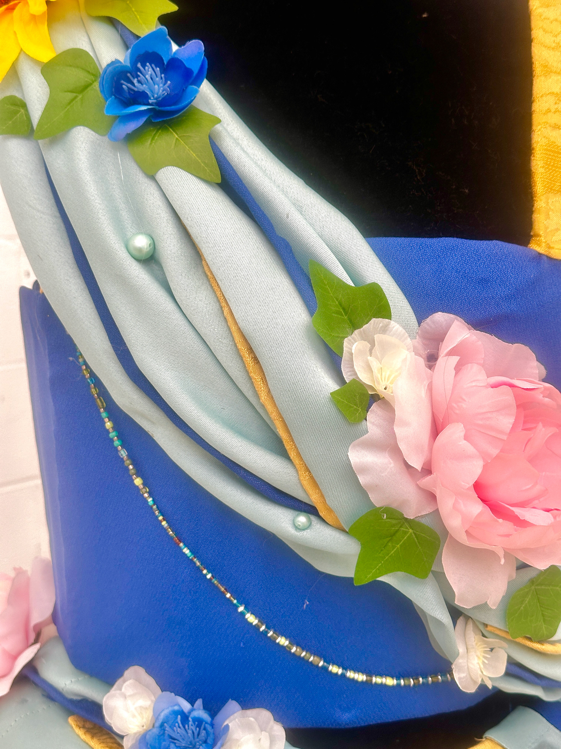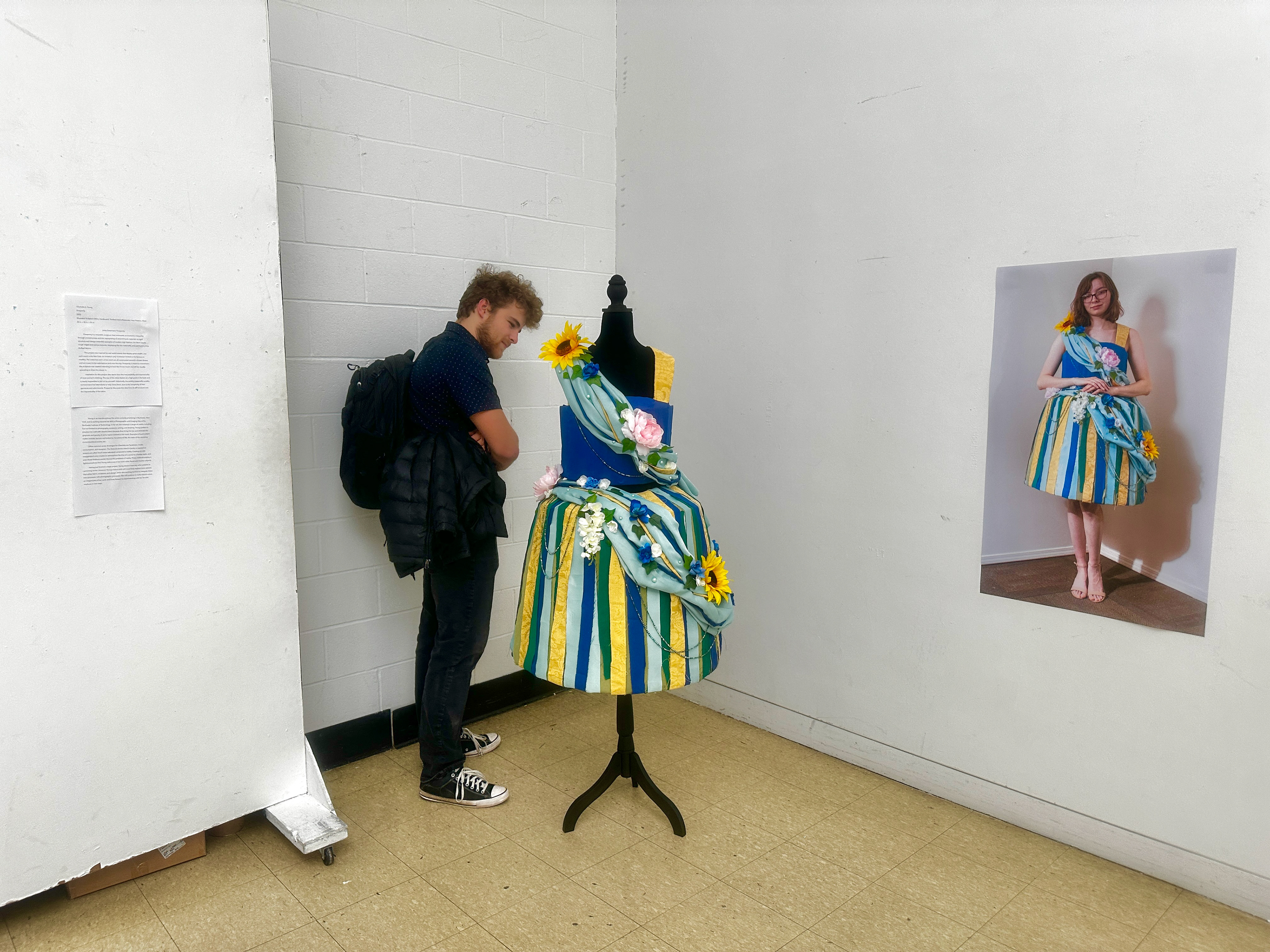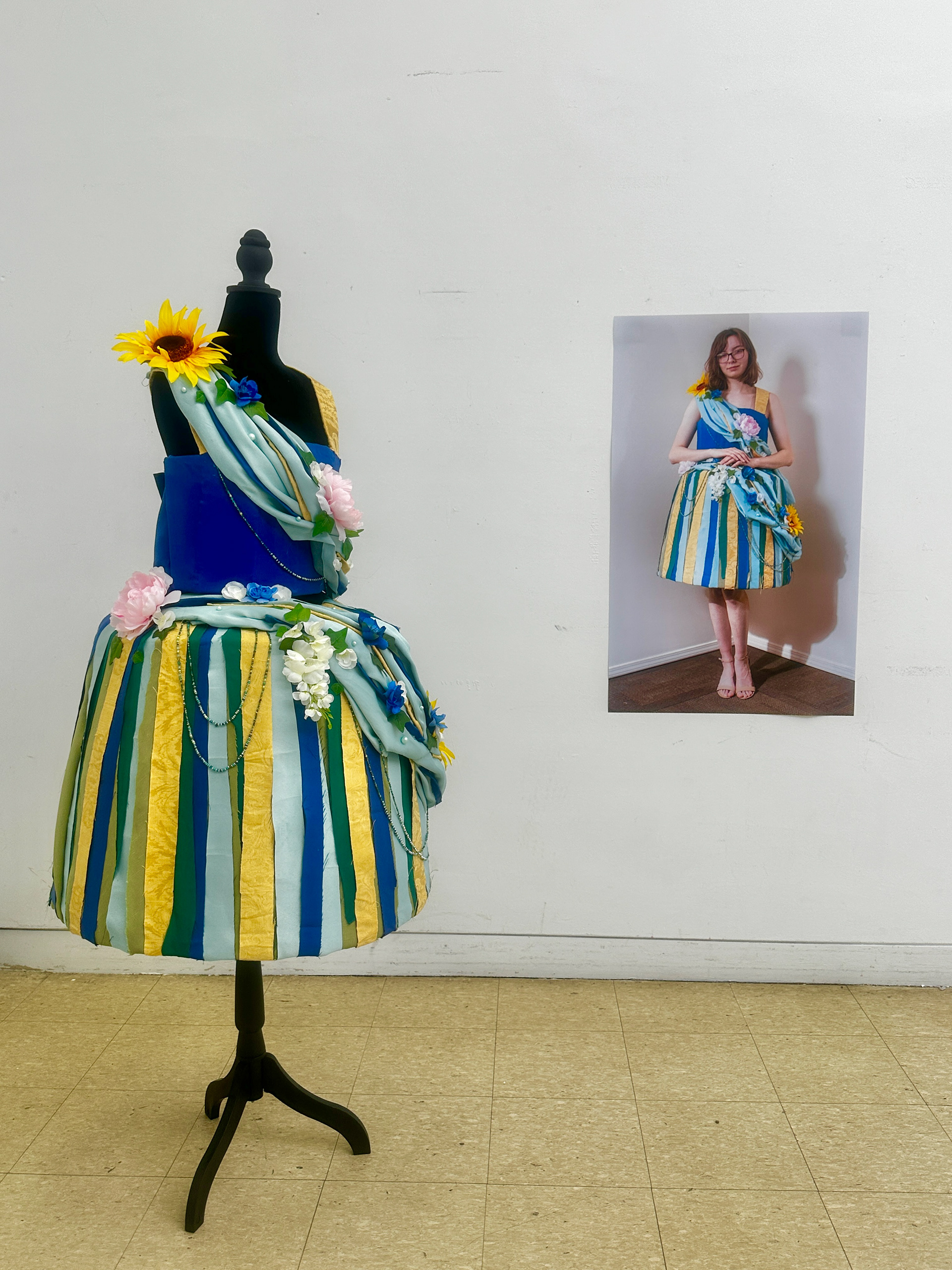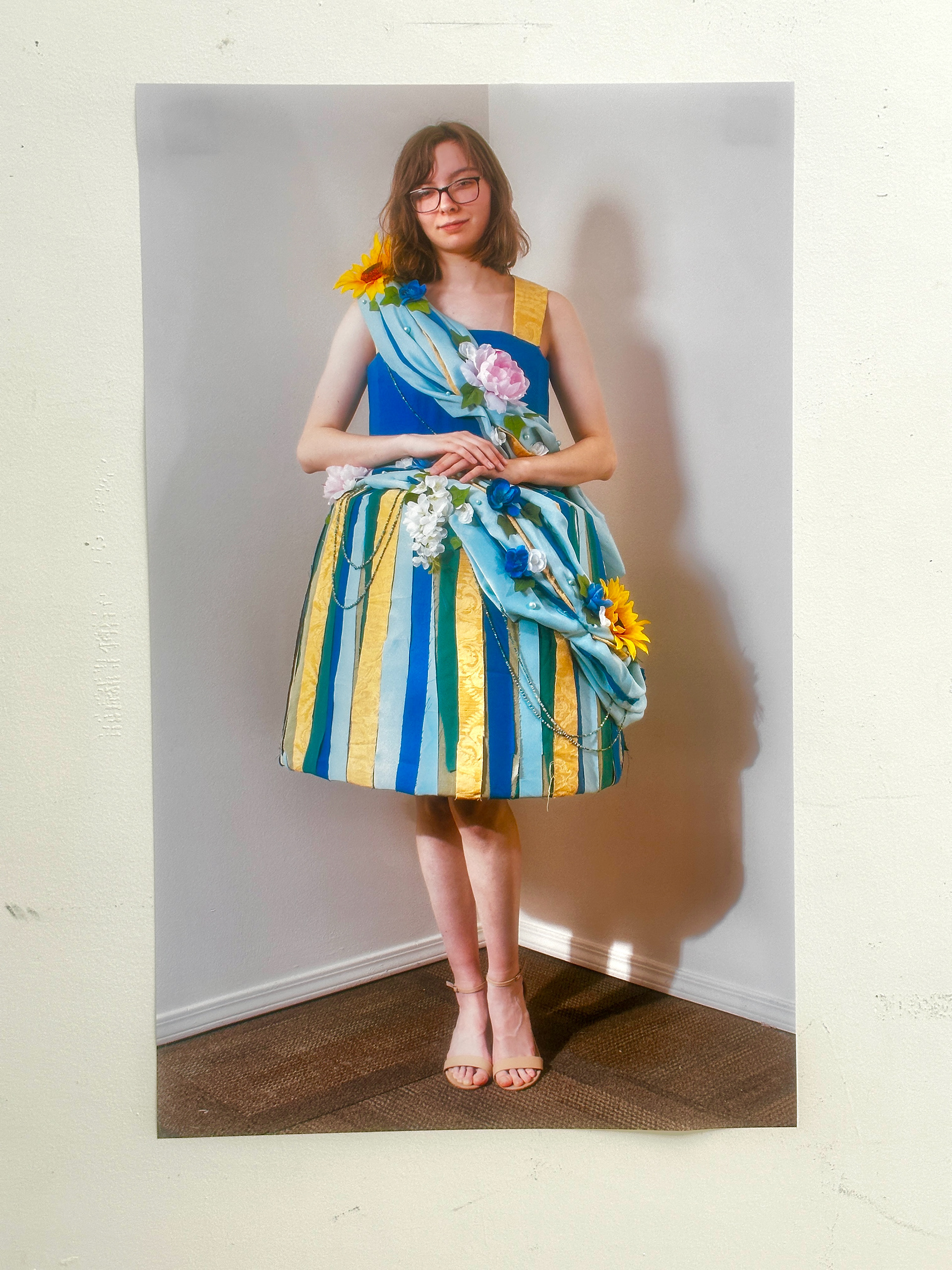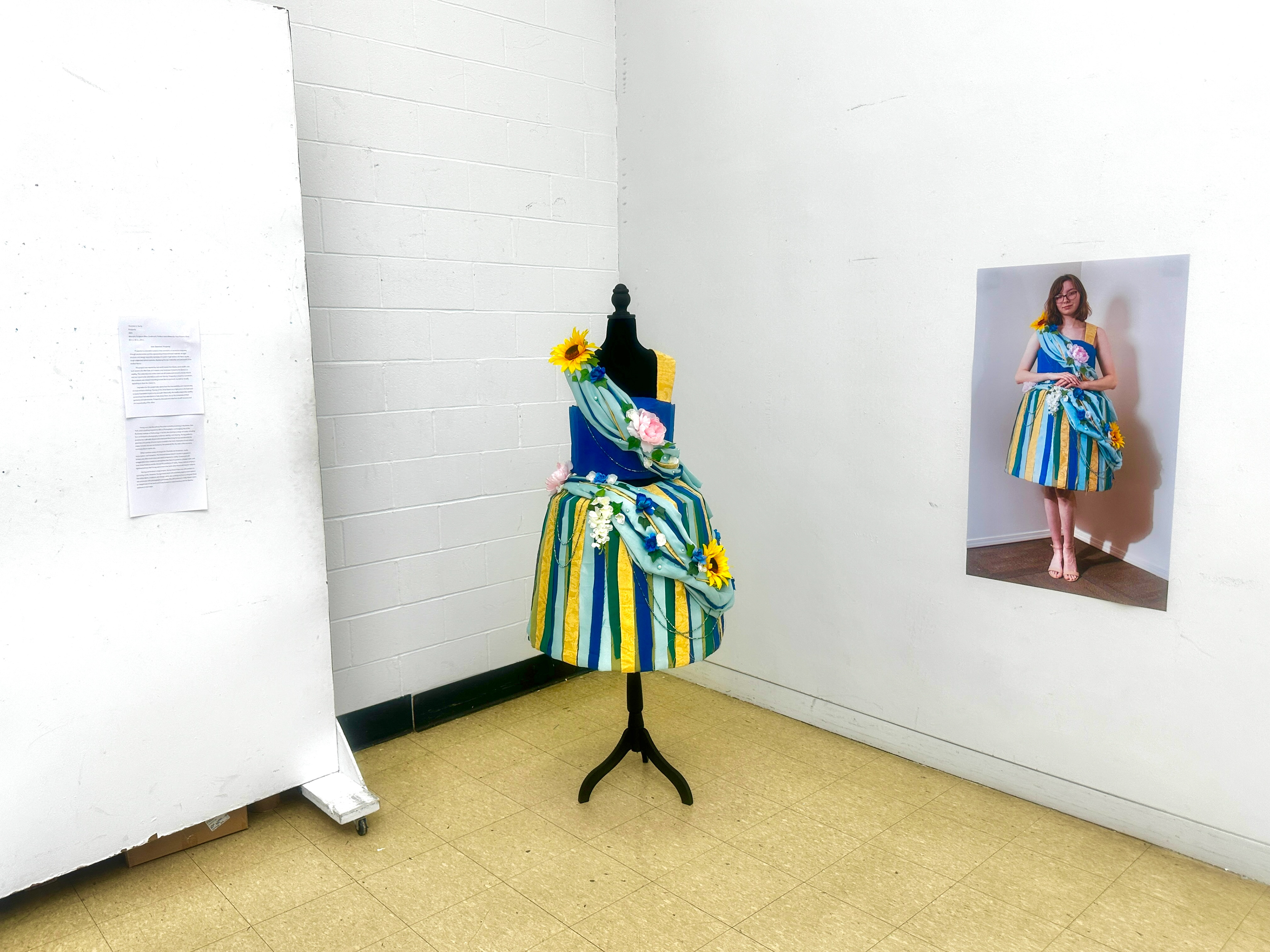 Prosperity is a sculpture that comments on economic inequality through excessiveness and the repurposing of second-hand materials. Its rigid structure and design resemble examples of modern high fashion; the fabric sports rough edges and various textures, displaying the raw materiality and patchwork of the thrifted fabrics. Additionally, some inspiration has been taken from the natural world, with the name ‘Prosperity’ relating to abundance and bountifulness. The draped fabric is meant to represent a river; the fluidity and movement starkly contrast with the rest of the dress. These make for an interesting juxtaposition of elements. The faux flowers add interesting textures and an overall more pleasing visual.